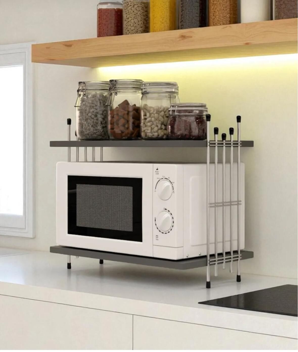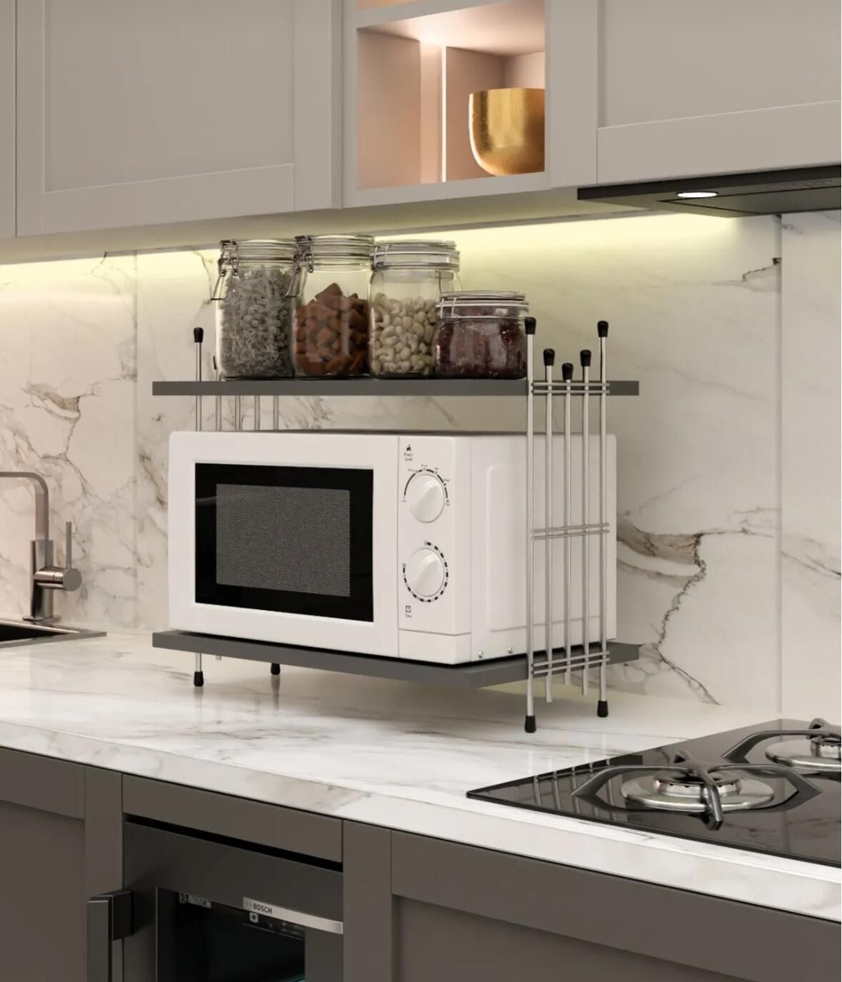 Küçük mutfaklarda yer kazanmak, dağınıklığı ortadan kaldırmak ve kullanım alanını estetikle birleştirmek isteyen herkes için ideal bir üründür.Mikrodalga Üstü Raf Tezgah Üstü Mutfak Organizer Antrasit Gümüş Tel Ayaklı Çok Amaçlı Raf Düzenleyici