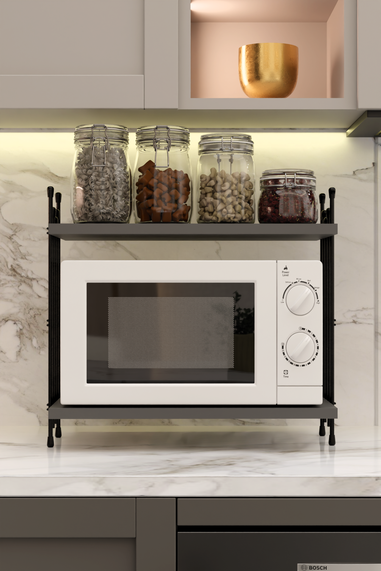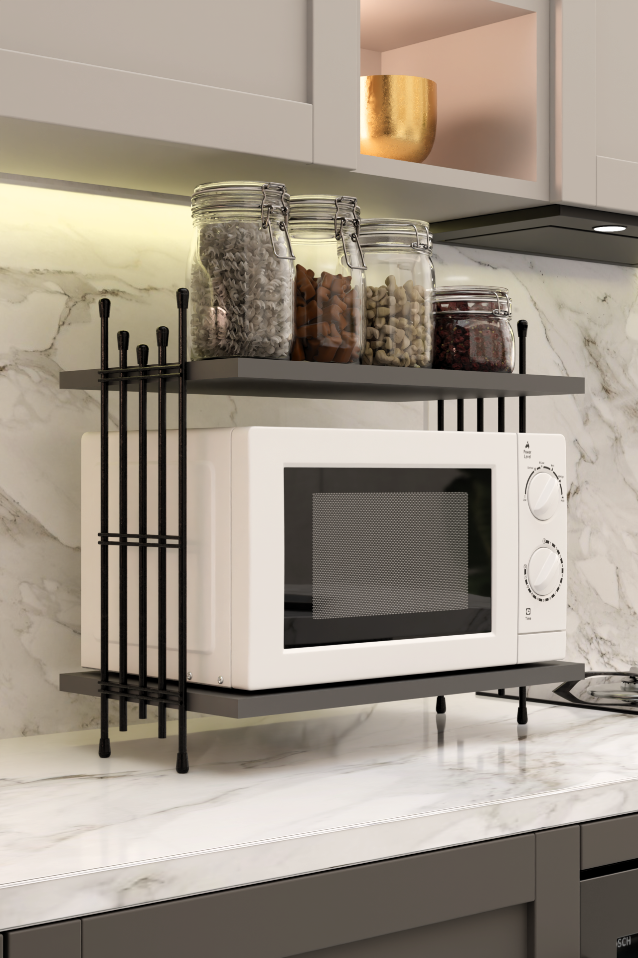 Küçük mutfaklarda yer kazanmak, dağınıklığı ortadan kaldırmak ve kullanım alanını estetikle birleştirmek isteyen herkes için ideal bir üründür.Mikrodalga Üstü Raf Tezgah Üstü Mutfak Organizer Antrasit Siyah Tel Ayaklı Çok Amaçlı Raf Düzenleyici