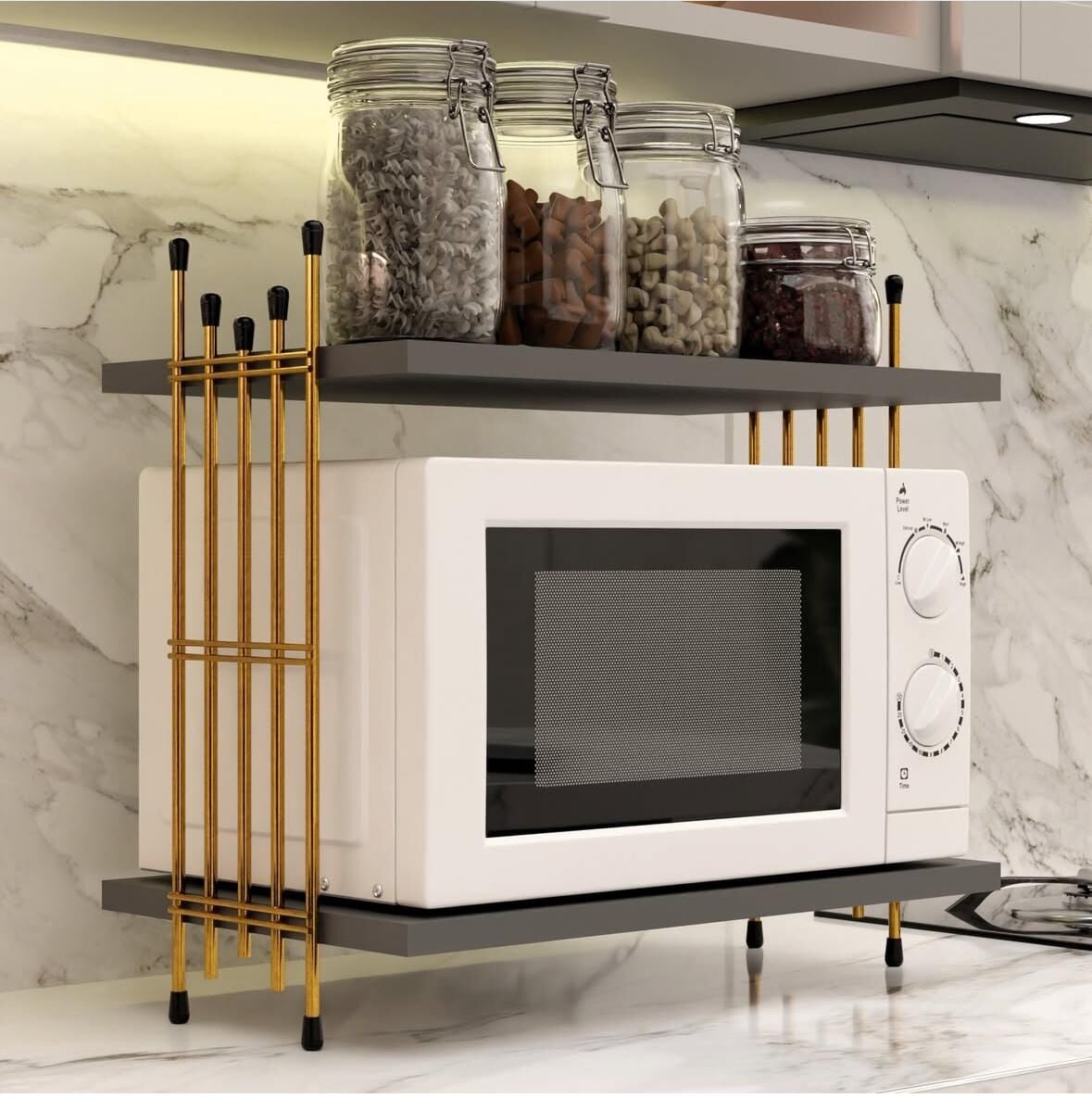 Modalanka Mikrodalga Üstü Mutfak Rafı – Antrasit / Beyaz / Atlantik Çam Tabla & Gold Renk Ayaklı