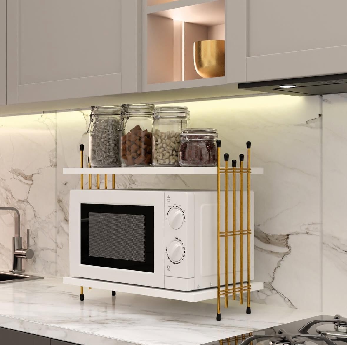 Küçük mutfaklarda yer kazanmak, dağınıklığı ortadan kaldırmak ve kullanım alanını estetikle birleştirmek isteyen herkes için ideal bir üründür.Mikrodalga Üstü Raf Tezgah Üstü Mutfak Organizer Gold Çam Tel Ayaklı Çok Amaçlı Raf DüzenleyiciMikrodalga üstü raf sistemi, küçük mutfaklarda yer kazanmak için idealdir." "Mikrodalga üstü raf, mutfakta hem fonksiyonel hem de dekoratif bir çözüm sunar."