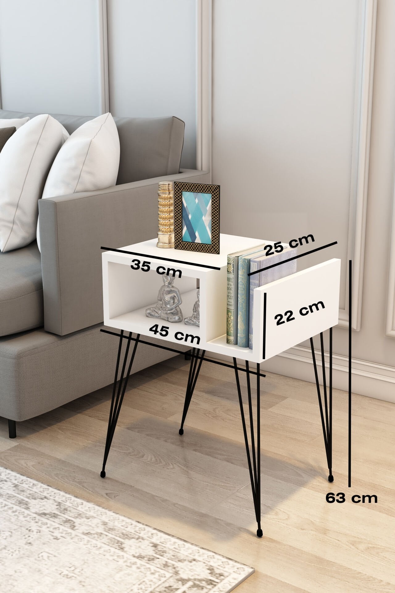 Modalanka Begonya Koltuk Yanı Sehpa - Raflı, Gazetelik, Süslük, Kitaplık, Dergilik ve Metal Ayaklı Şık Sehpa Beyaz Begonya Koltuk Yanı Sehpa Raflı, Gazetelik Bölmeli, Metal Ayaklı, Şık ve Fonksiyonel Tasarım Ürün Açıklaması Begonya Koltuk Yanı Sehpa, hem şık hem de işlevsel tasarımıyla ev ve ofis dekorasyonlarınıza modern bir dokunuş ekler. Alt kısmındaki raflar ve gazetelik bölmesi, ekstra depolama alanı sunarak kitaplarınızı, dergilerinizi ve dekoratif eşyalarınızı düzenli tutmanıza yardımcı olur. 1. sınıf yonga levha malzemesi ve metal ayakları, dayanıklılığı ve uzun ömürlü kullanımı garantiler. Sağlam ve güvenilir yapısı ile uzun yıllar sorunsuz şekilde kullanabilirsiniz. Ürün, özel olarak paketlenmiş ve demonte olarak sevk edilmektedir. Kolay montaj için kurulum şeması ve vida seti koli içinde yer alır. Basit el aletleri ile zahmetsizce monte edilebilir, böylece ek maliyet veya zaman kaybı yaşamadan ürünü kurabilirsiniz. begonyabeyaz
