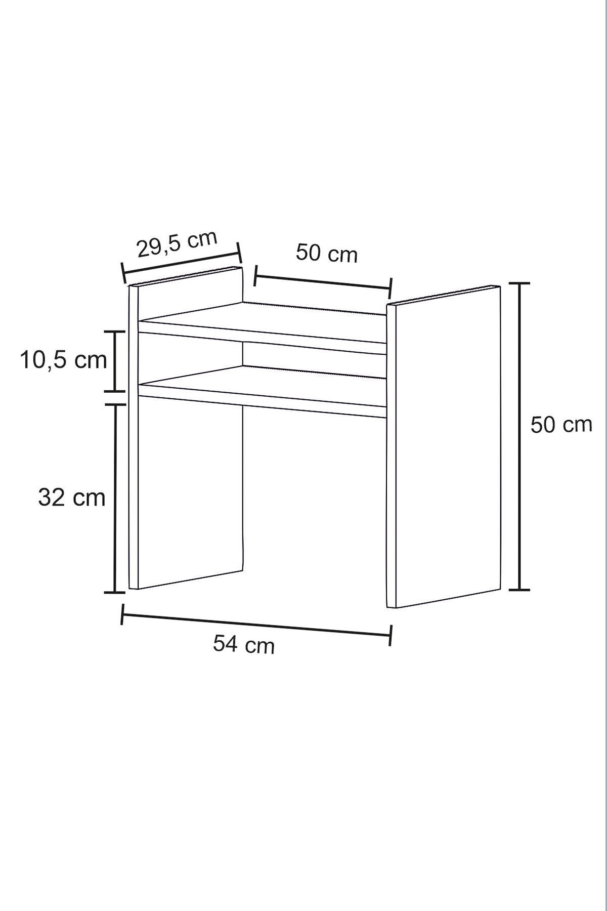 - Genişlik: 54 cm, Derinlik: 29,5 cm, Yükseklik: 50 cm, Alt raf yükseklik: 32 cm, Ara raf yükseklik: 10,5 cm.